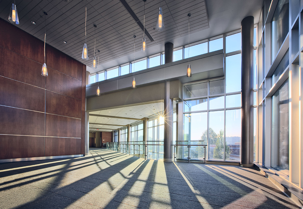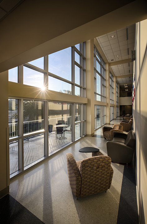 The facility features 26 classrooms, a large group instruction area, computer labs, a learning resource area and cafe. The space is also able to host campus events and gatherings of various sizes.