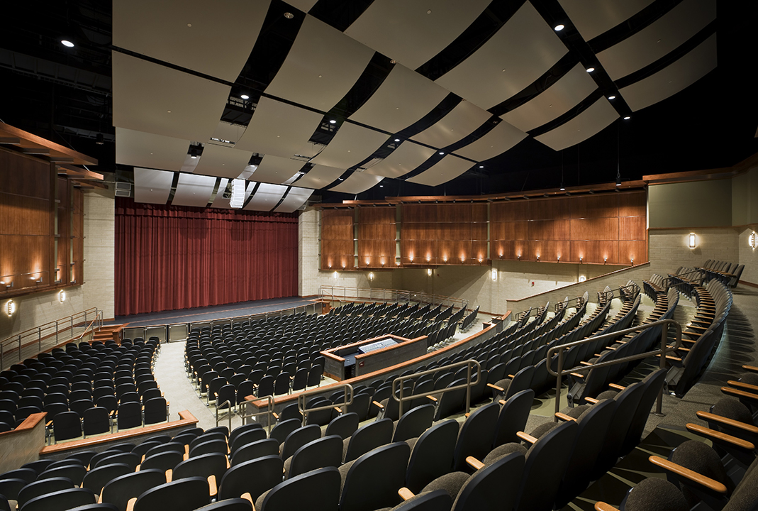 RLPS teamed with Schuler Shook to provide theatre planning and design services for the performance and supports spaces, an orchestra pit lift, and complete theatrical lighting and rigging systems. The building is located in a very prominent location at the center of the campus and features a glass, two-story lobby with outdoor terrace space. The theater is linked to an adjacent existing gymnasium structure which was renovated to provide classrooms, offices and support spaces to create the Humanities Center.